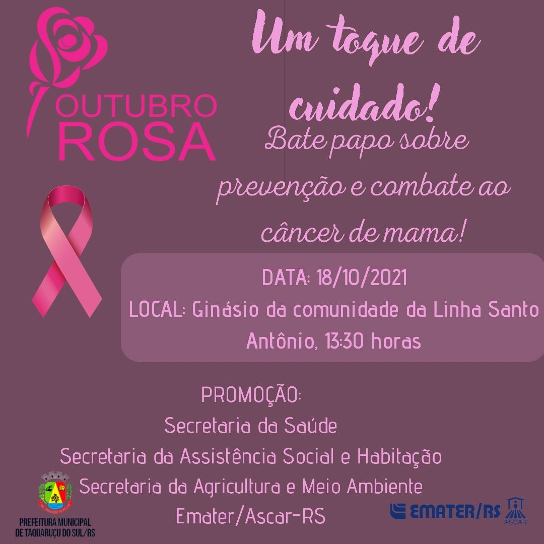 A administração municipal de Taquaruçu do Sul através das secretarias da saúde, assistência social e habitação, agricultura e meio ambiente, juntamente com a Emater, convidam a todas as mulheres do município a participarem da campanha de prevenção e combate ao câncer de mama, \"UM TOQUE DE CUIDADO\".