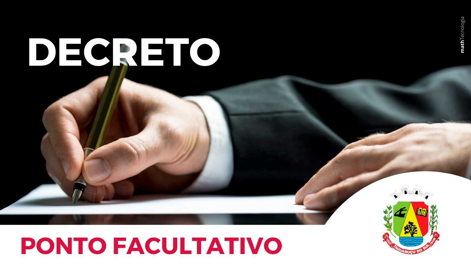 Art. 1º. É declarado Ponto Facultativo no expediente dos órgãos, repartições e serviços públicos municipais em todo o território do município de Taquaruçu do Sul, no turno da manhã do dia 31 de Dezembro de 2021, como forma de atender à necessidade de economizar recursos para o erário público municipal em despesas com serviços que não sejam urgentes e ensejar a oportunidade de convivência familiar dos servidores públicos municipais mais prolongada