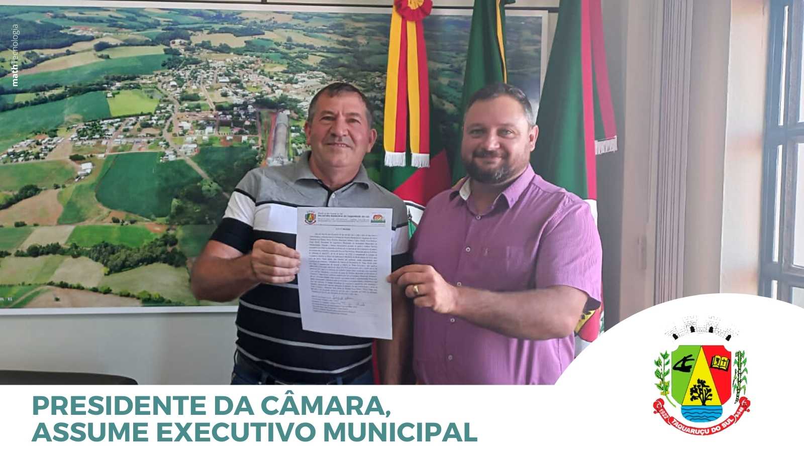 Nesta segunda-feira, 10, compareceram no Gabinete do Prefeito Municipal de Taquaruçu do Sul os Senhores Luiz Blanco Alves, Prefeito Municipal, Gilberto Carlos Chiele, Vice-Prefeito, Tiago Stival, Presidente do Legislativo Municipal, os Secretários Municipais de Administração, Fazenda e demais funcionários, perante os quais o Senhor Prefeito comunicou que estará se afastando do Municipio no periodo de dez a dezenove de janeiro do corrente ano, conforme comunicado feito ao Vice-Prefeito Municipal através do Oficio de Gabinete n° 004/2022. de 04 de janeiro de 2022, e comunicado à Câmara de Vereadores, através do Oficio de Gabinete n° 006/2022, de 06 de janeiro de 2022, para gozo de férias. Disse ainda, que, durante sua ausência, estará respondendo pelo expediente do Gabinete o Presidente da Câmara de Vereadores, Sr. Tiago Stival, tendo em vista, o impedimento de exercer a Chefia do Poder Executivo, por motivos particulares, informado através do oficio 001/2022 protocolado sob o nº002 em 05 de janeiro de 2022, pelo Vice-Prefeito. Sr. Gilberto Carlos Chiele, sendo que, neste momento e por este ato, transmitiu o exercício do cargo de Prefeito Municipal ao Presidente do Legislativo Tiago Stival. conforme estabelecido na Lei Orgânica Municipal, desejando lhe um excelente trabalho neste periodo que estará frente à Administração Municipal, dando continuidade e desenvolvendo as atividades com tranquilidade e competència que lhes são inerentes.O Senhor Presidente do Legislativo agradeceu com satisfação e honradez, prometendo máxima dedicação no periodo em que estará frente a chefia do Poder Executivo, desejando boas férias ao Prefeito Luiz Blanco Alves.