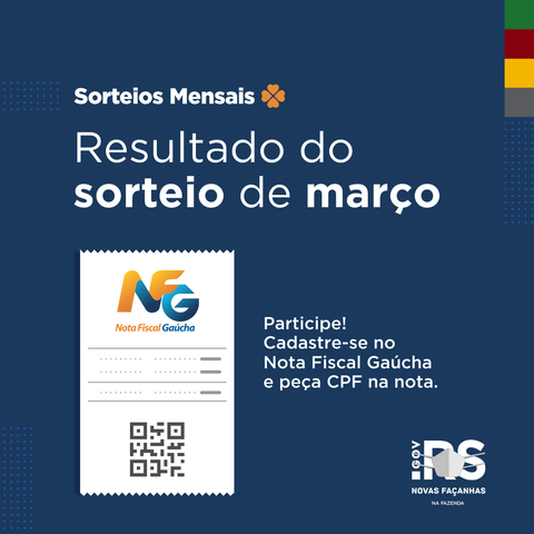 No dia 31 de março, a Plataforma do Programa Nota Fiscal Gaúcha realizou o sorteio mensal dos prêmios estadual e municipais, referentes ao mês de Março/2022.