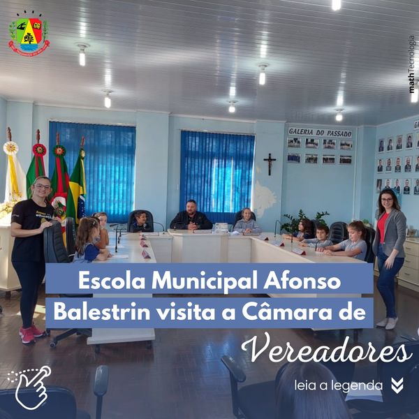 Na tarde do dia 06 de maio, os alunos do 4º ano da Escola Municipal Afonso Balestrin, juntamente com a monitora e professora Susana Schwartz Basso, visitaram a sede da Câmara de Vereadores do município, a fim de aprofundar o estudo sobre os poderes municipais.