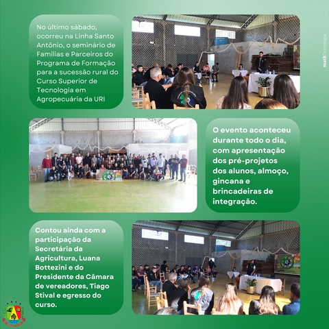 No último sábado (09/07), ocorreu na comunidade da Linha Santo Antônio, o seminário de Famílias e Parceiros do Programa de Formação para a sucessão rural do Curso Superior de Tecnologia em Agropecuária da URI. O evento aconteceu durante todo o dia, com apresentação dos pré-projetos dos alunos, almoço, gincana e brincadeiras de integração.