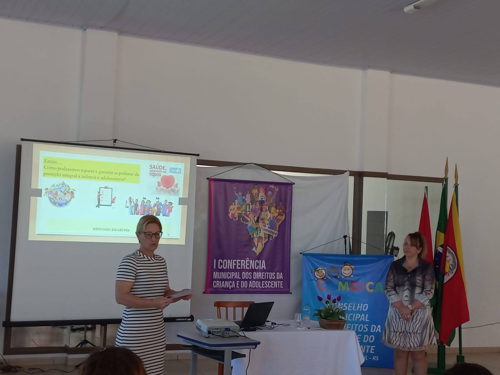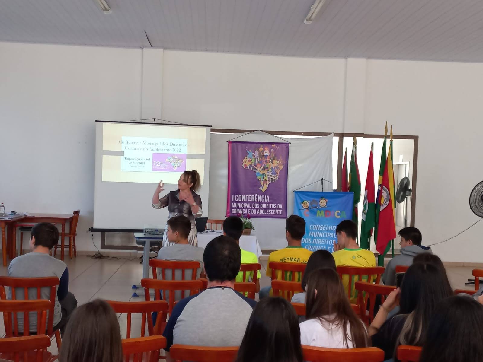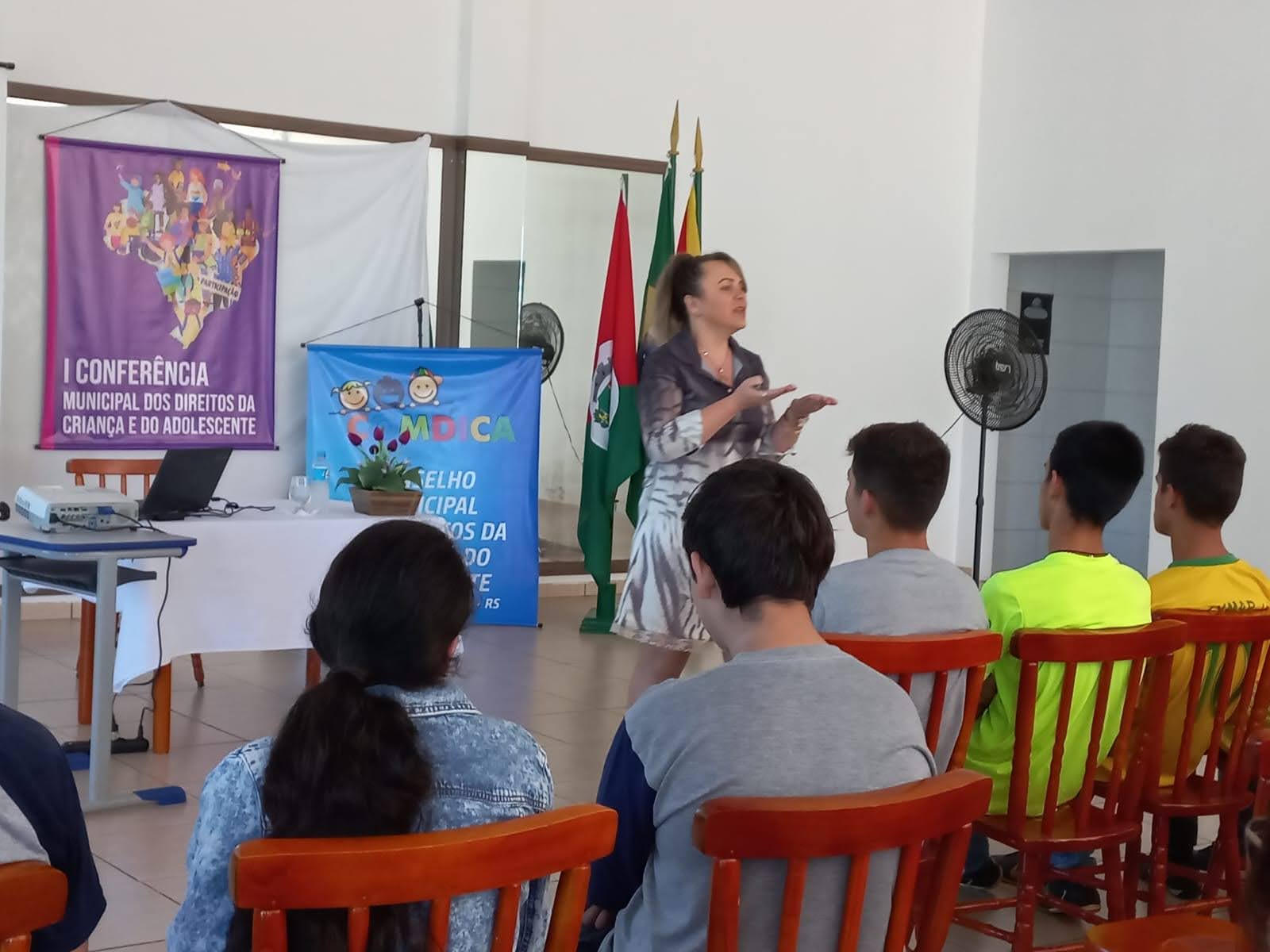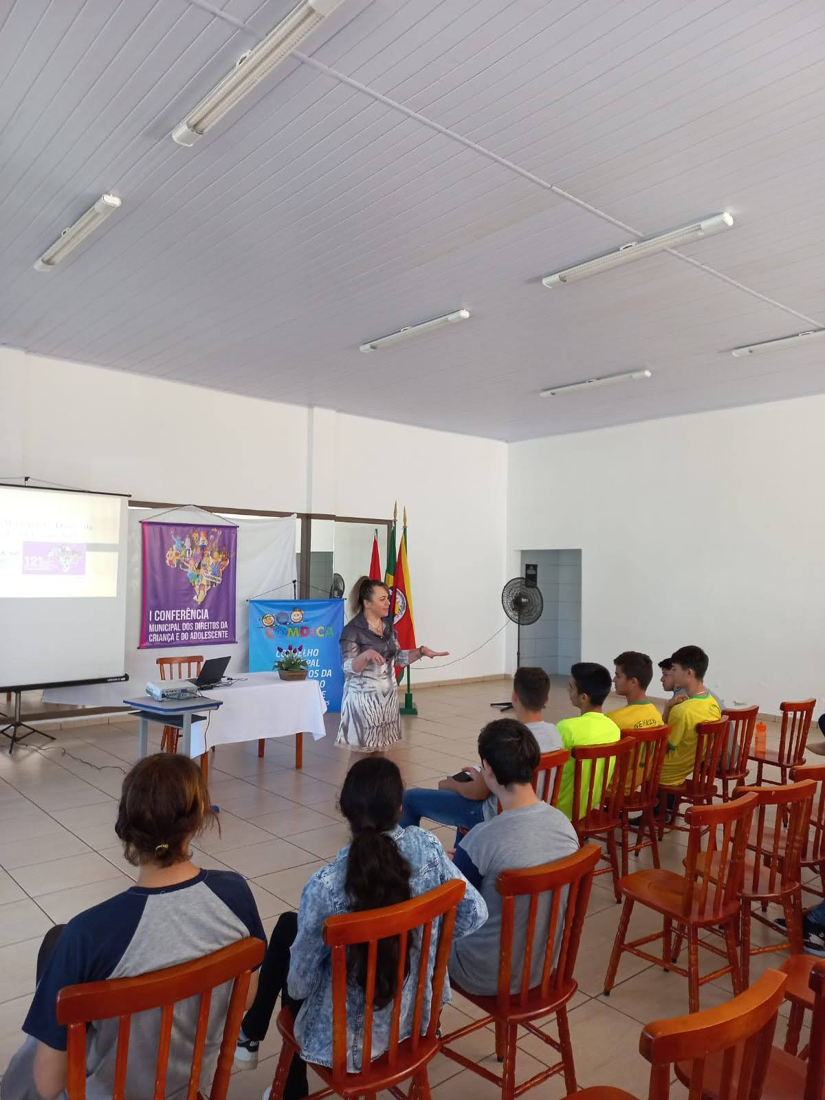 O objetivo principal da conferência foi debater e buscar alternativas para melhorar os reflexos da pandemia da Covid-19 deixados na vida das crianças, adolescentes e suas famílias, construindo propostas de ação e políticas públicas que garantam os seus direitos no contexto pandêmico e pós-pandemia, e para discutir sobre isto Fabiana Zanardi, Assistente Social no Município de Palmitinho, conduziu os trabalhos e palestrou para os presentes falando sobre o objetivo da conferência e a importância que a mesma tem para que sejam levantadas propostas para melhorar o contexto atual em que vivem nossas crianças e adolescentes a partir das demandas escolhidas por eles.
