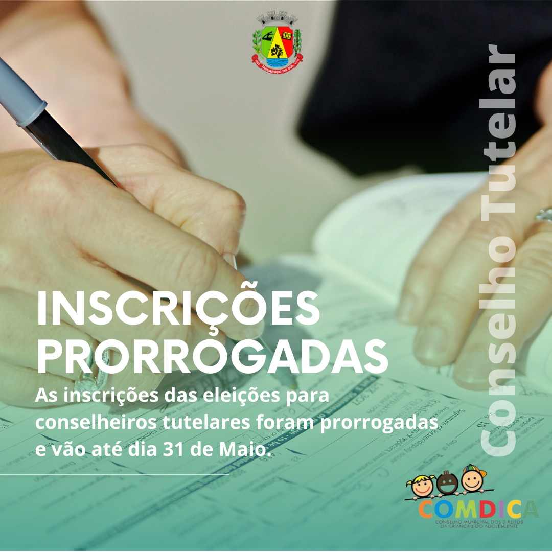 PRORROGADAS INSCRIÇÕES PARA CONSELHEIROS TUTELARESAtravés do Edital nº 003/2023, de 17 de maio de 2023, o Conselho Municipal dos Direitos da Criança e Adolescente COMDICA, prorrogou até o dia 31 de maio, o prazo de inscrições para interessados em participar do processo de escolha para a composição do Conselho Tutelar de Taquaruçu do Sul.