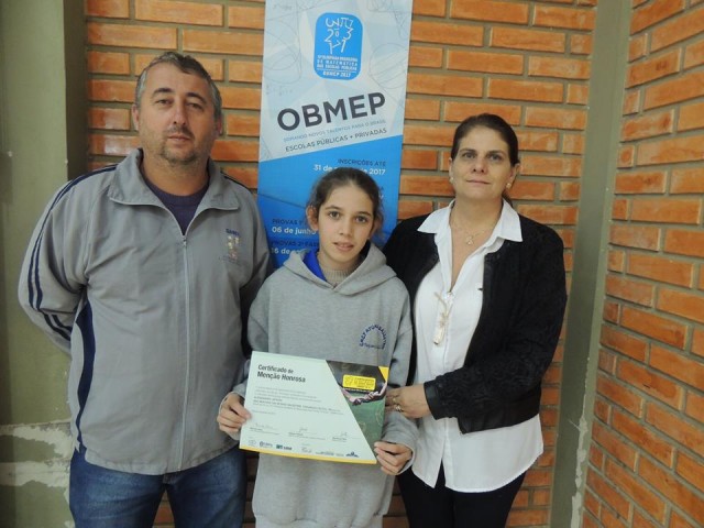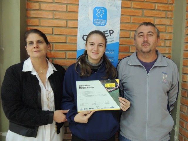 A certificação de medalhista de ouro da OBMEP 2016 ao aluno Junior Pessotto foi entregue em Passo Fundo, durante cerimônia que contou com alunos de vários municípios do Estado, e com a participação da professora Adriana Zanchet e da Secretária Municipal de Educação Alda da Rosa Martins.