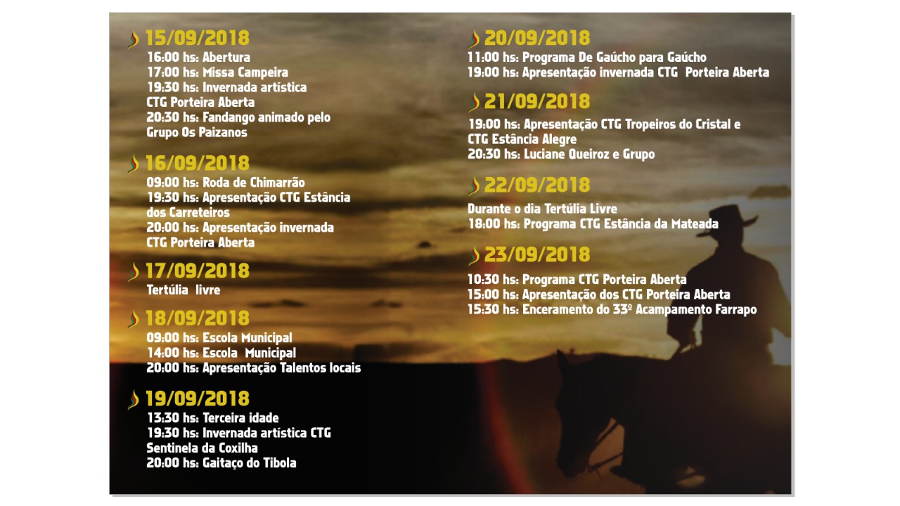 A programação completa do 33º Acampamento Farrapo é a seguinte: