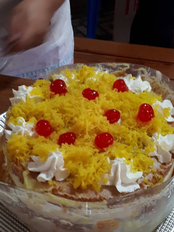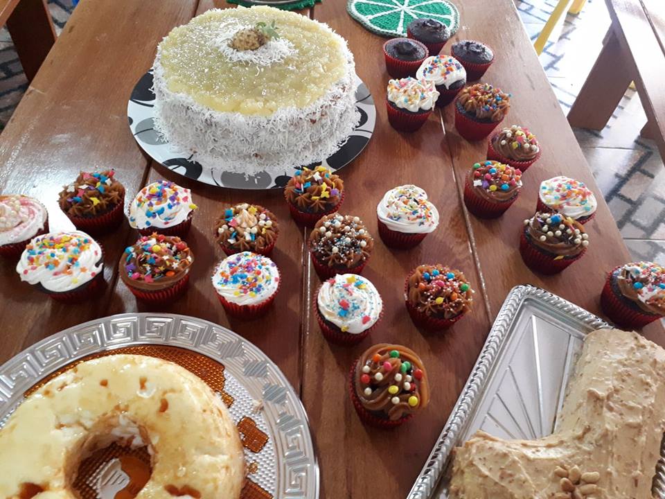 Foram feitos 9 tipos de bolos sendo essas: Torta de abacaxi com coco, torta trufada de morango, marta rocha, torta de chocolate, torta de limão siciliano, torta de nozes, bolo floresta negra, Rocambole de Amendoin e doce de Leite e pudim de clara.