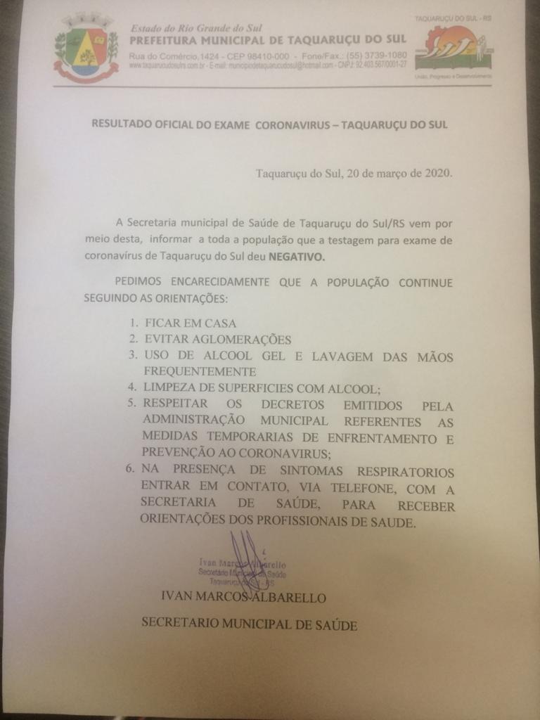 Apesar do resultado negativo, o secretário da pasta Ivan Albarello, pede aos munícipes que continuem seguindo as orientações emitidas pela Administração Municipal nesta quinta-feira, 19, válidas, até 3 de abril. Os taquaruçuenses estão de parabéns por tomar as precauções iniciais, mas devemos seguir fortes para evitar que o coronavírus se alastre, comemorou Albarello.