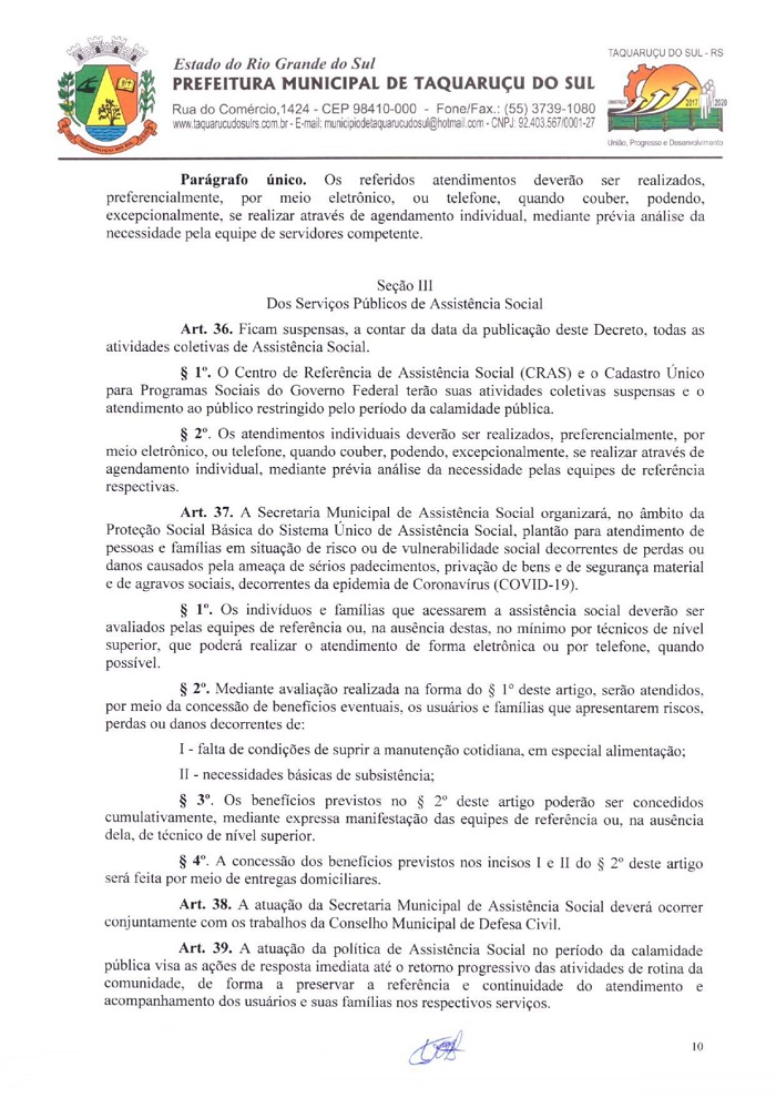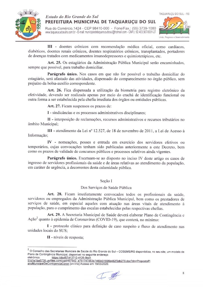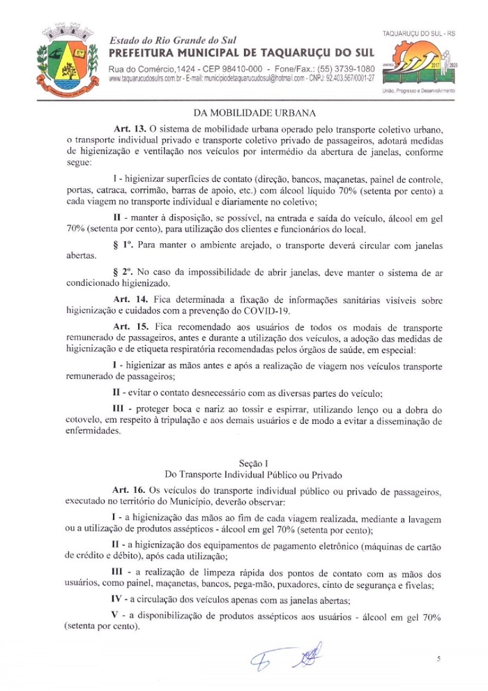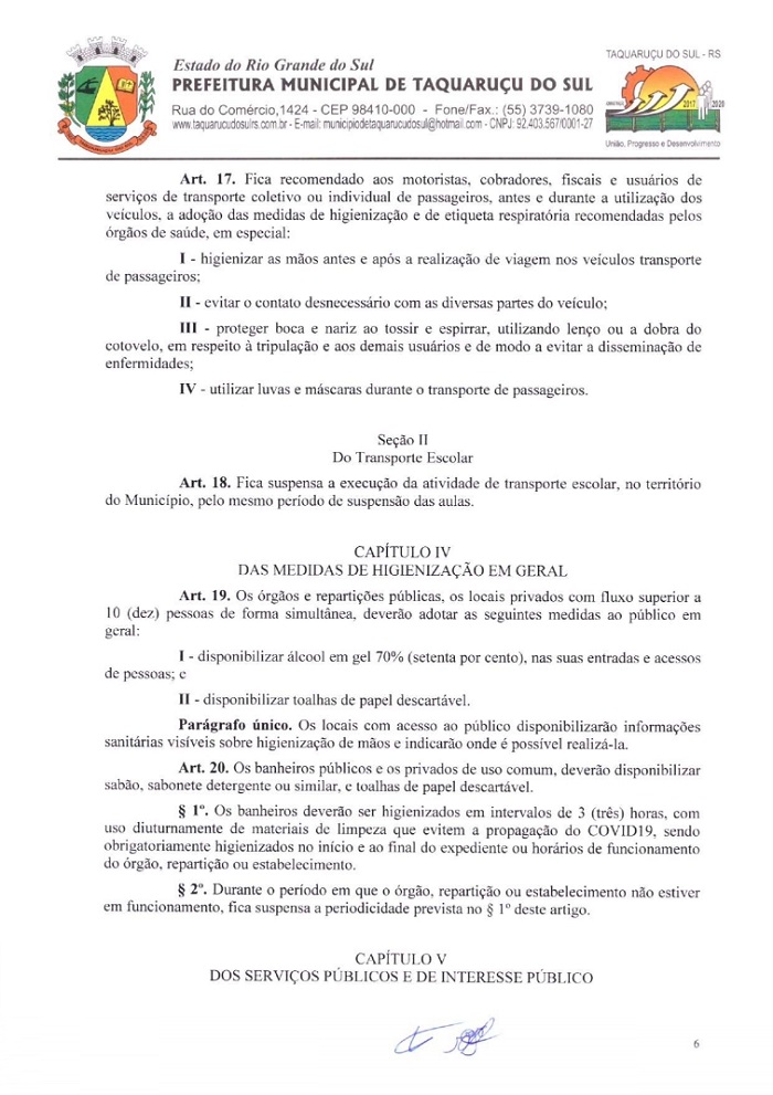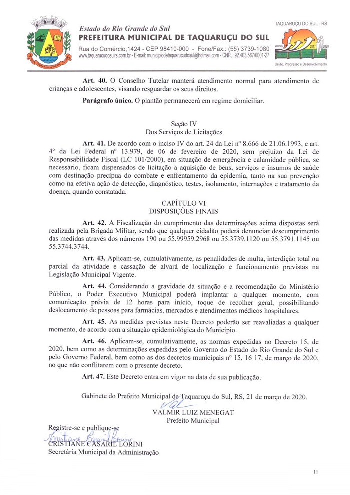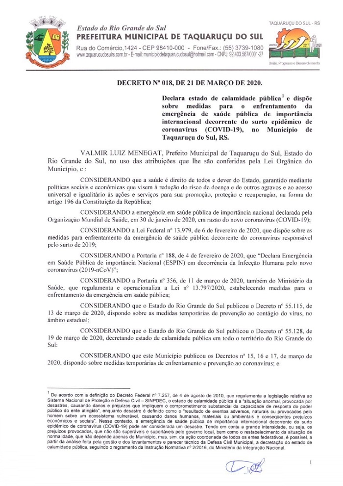 A pedido do Ministério Público, de Frederico Westphalen (MP-FW), a Administração de Taquaruçu do Sul, publicou na tarde deste sábado, 21, o Decreto Municipal Nº 18, nas quais foram alterados artigos e incluídos outros para prevenir a comunidade do avanço do Coronavírus (Covid-19). A partir desta data, o município decreta a situação de calamidade, em todo o seu território por 15 dias descritos nos decretos de números 15, 16 e 17, que estão em vigor. Fica vedada a circulação de pessoas que retornaram de viagens internacionais e cidades que tenham casos suspeitos ou confirmados. Os mesmos devem respeitar a quarentena em isolamento domiciliar de 14 dias. Já as pessoas que estão em deslocamento a Taquaruçu e possuem qualquer tipo de sintomas, favor entrar em contato com a Secretaria de Saúde, através do telefone 3739-1035.