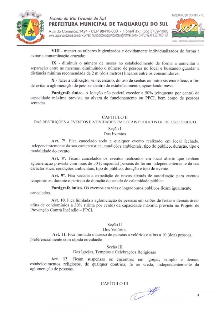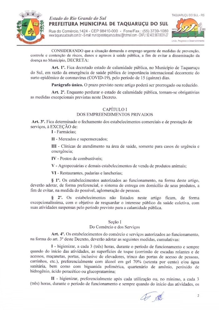 Segundo o Art.3°, fica determinado que apenas farmácias, supermercados, clinicas da área da saúde, postos de combustíveis, agropecuárias, restaurantes e lancherias permaneçam abertos. Os estabelecimentos autorizados devem adotar medidas a fim de evitar aglomerações, utilizando o sistema de entregas a domicílio ou limitando número de clientes. Os demais devem seguir fechados, inclusive, as agências bancárias as quais precisam manter seus caixas eletrônicos em funcionamento, como consta no Art.21º.