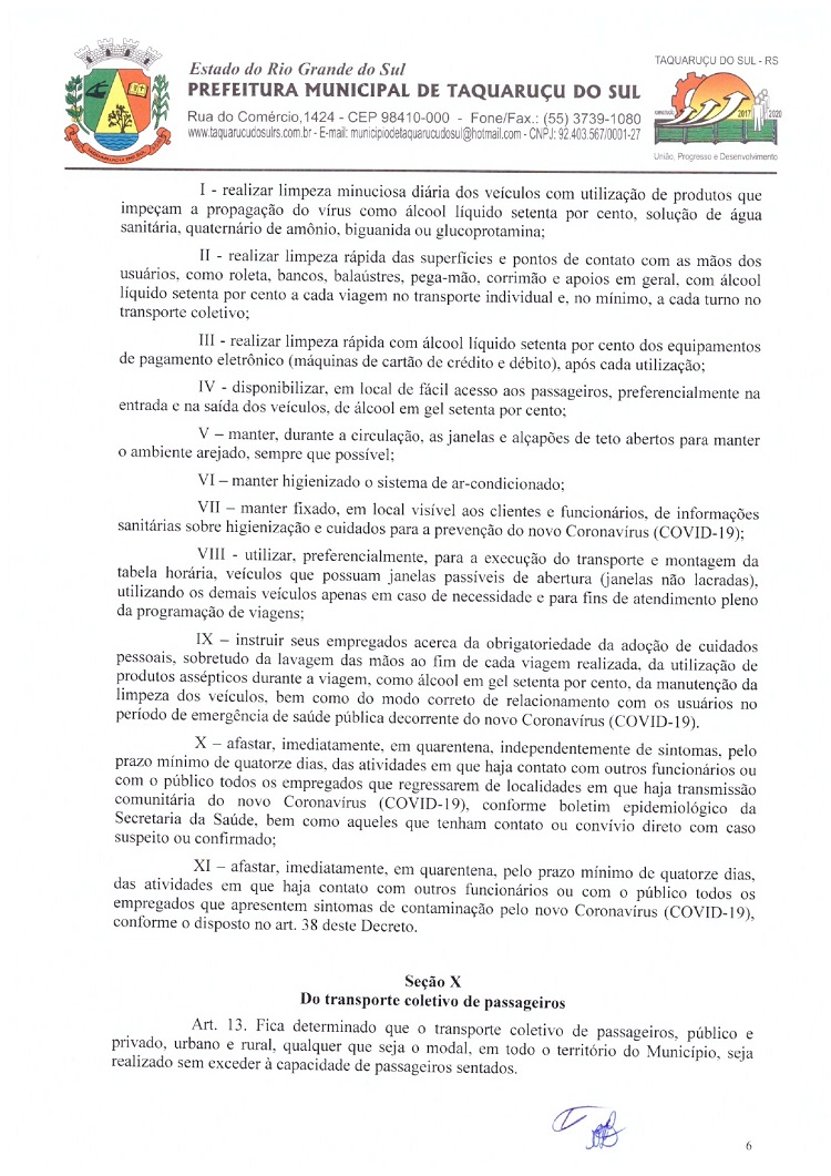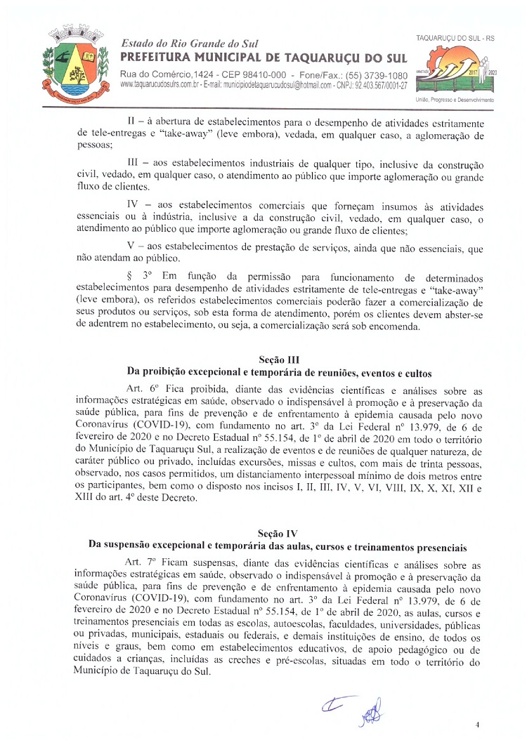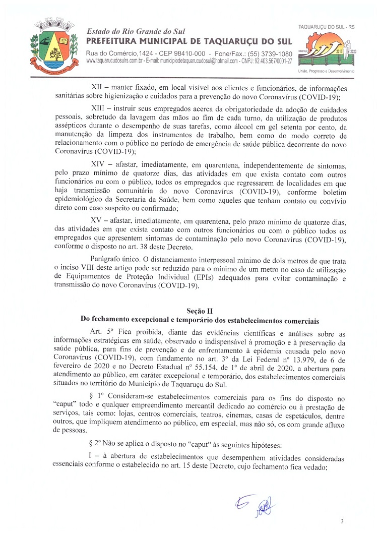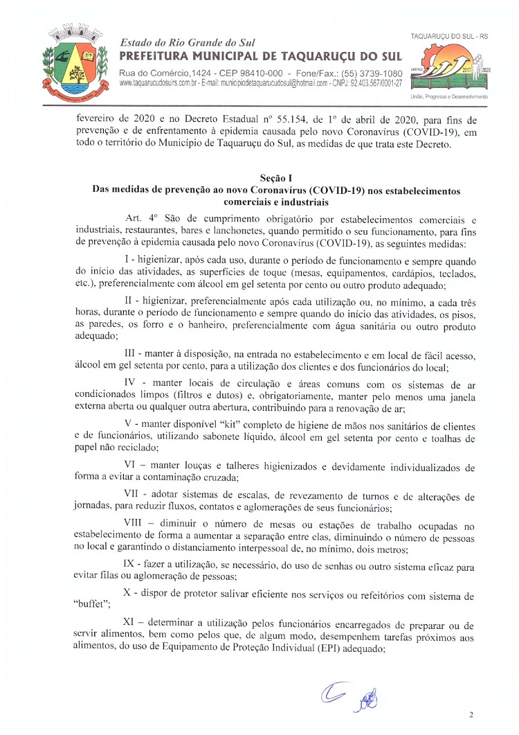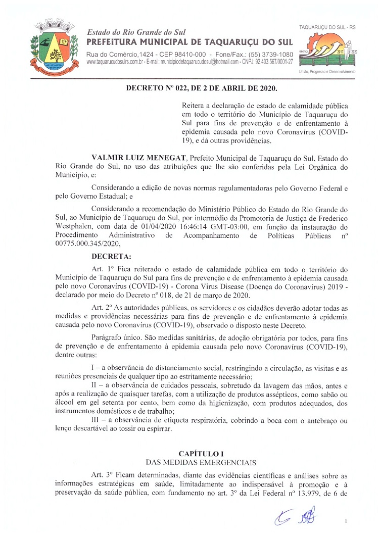 Atendendo as determinações do Governo do Rio Grande do Sul e do Ministério Público de Frederico Westphalen (MP/FW), o prefeito de Taquaruçu do Sul, Valmir Luiz Menegat, assinou na tarde desta sexta-feira, 3, o Decreto Municipal Nº 22, que reitera o estado de calamidade em todo o seu território para prevenir o avanço do Coronavírus (Covid-19). A partir desta data, fica determinado que apenas supermercados, farmácias, postos de combustíveis, agropecuárias, restaurantes e lancherias permaneçam abertos. Os estabelecimentos autorizados devem adotar medidas a fim de evitar aglomerações, utilizando o sistema de tele-entrega, além de fixar horários ou setores exclusivos para clientes com idade superior a 60 anos.