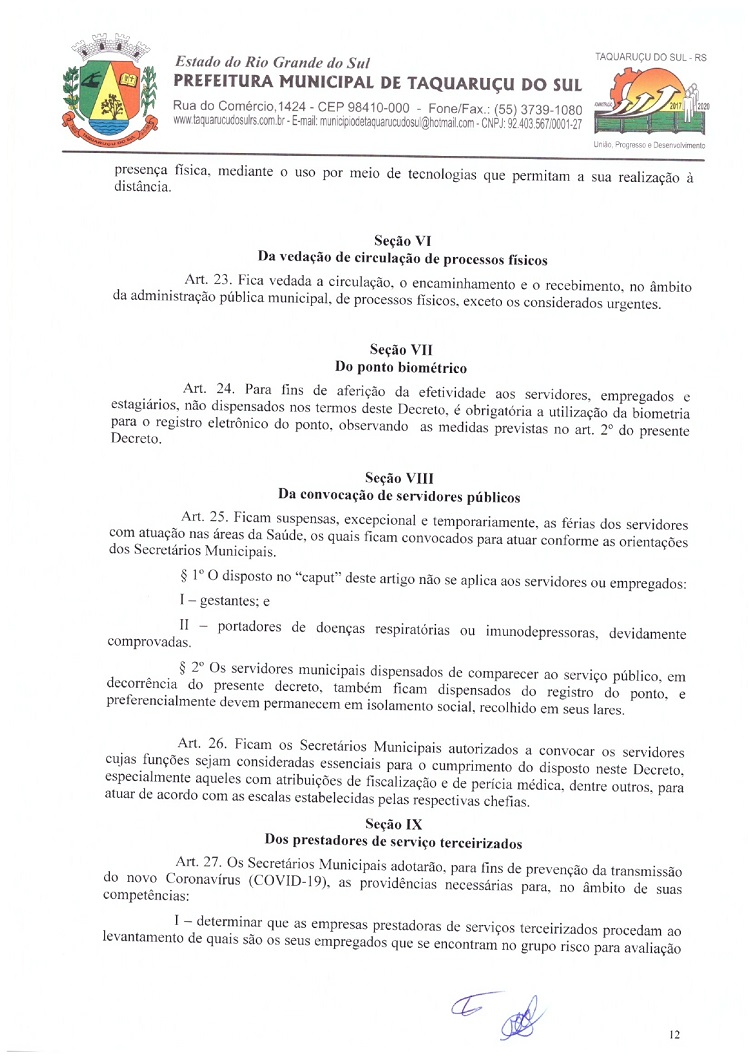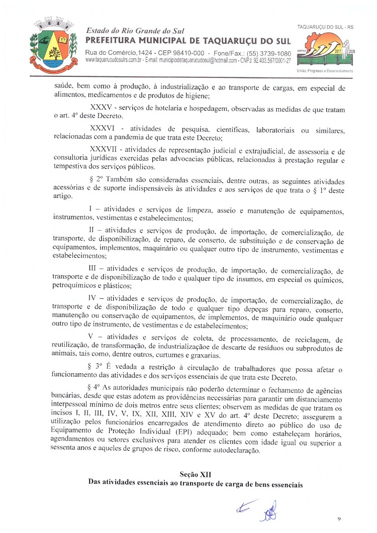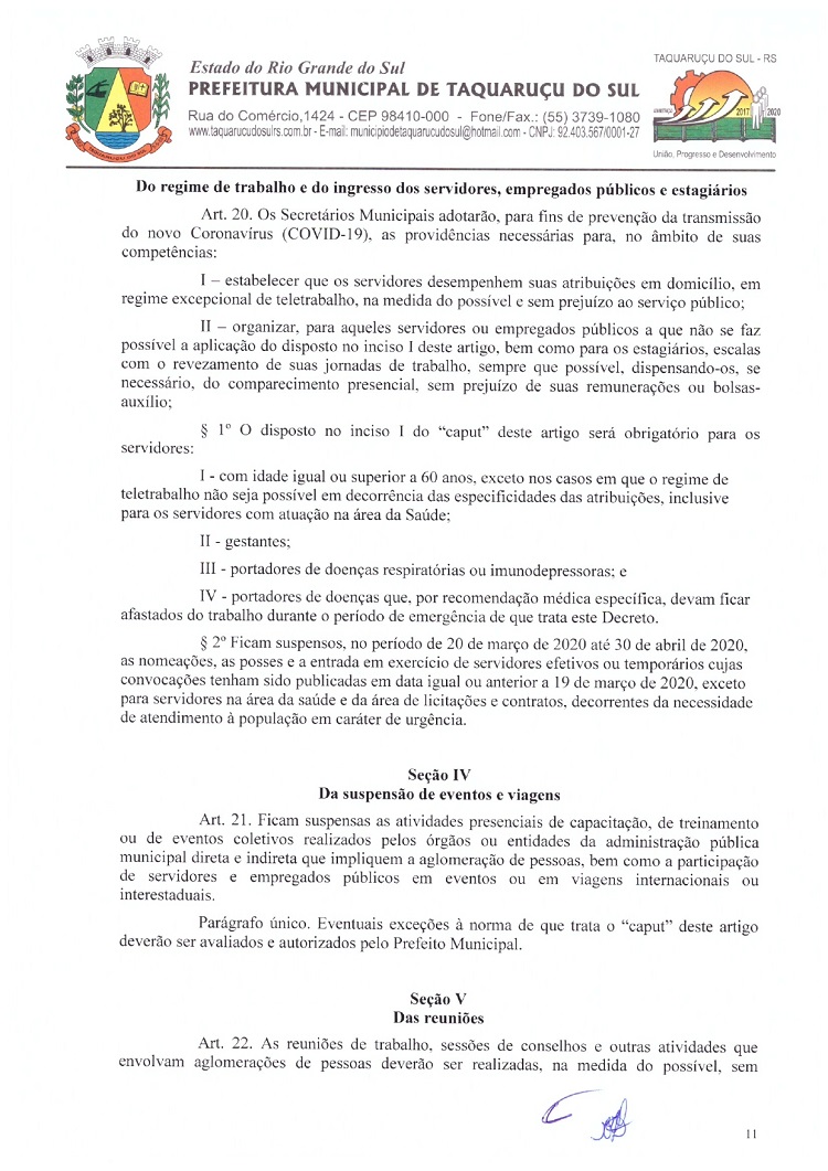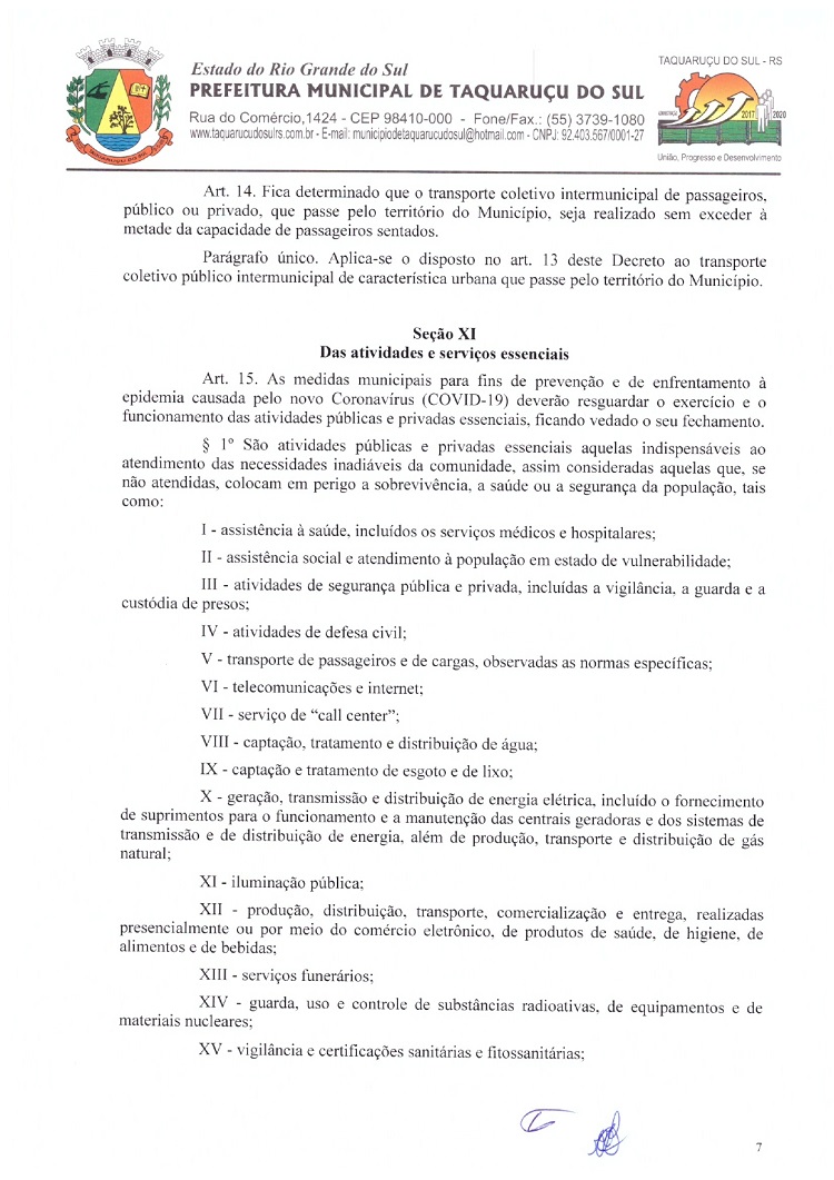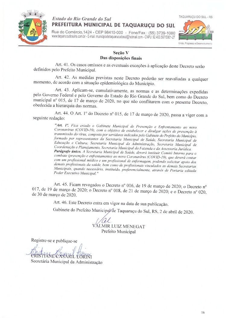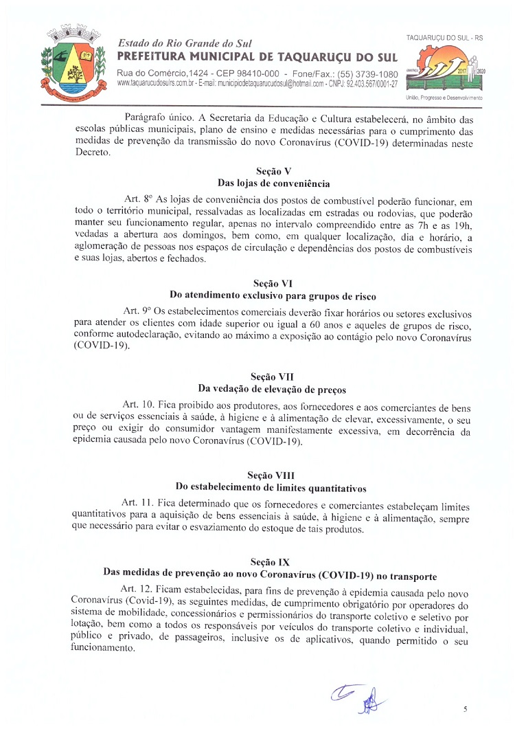Atendendo as determinações do Governo do Rio Grande do Sul e do Ministério Público de Frederico Westphalen (MP/FW), o prefeito de Taquaruçu do Sul, Valmir Luiz Menegat, assinou na tarde desta sexta-feira, 3, o Decreto Municipal Nº 22, que reitera o estado de calamidade em todo o seu território para prevenir o avanço do Coronavírus (Covid-19). A partir desta data, fica determinado que apenas supermercados, farmácias, postos de combustíveis, agropecuárias, restaurantes e lancherias permaneçam abertos. Os estabelecimentos autorizados devem adotar medidas a fim de evitar aglomerações, utilizando o sistema de tele-entrega, além de fixar horários ou setores exclusivos para clientes com idade superior a 60 anos.
