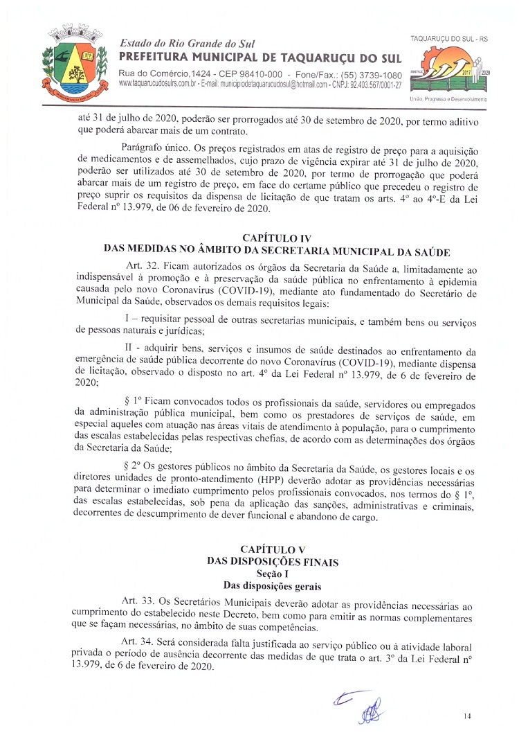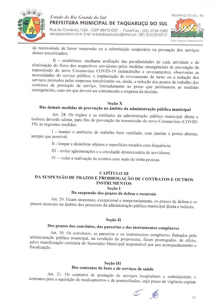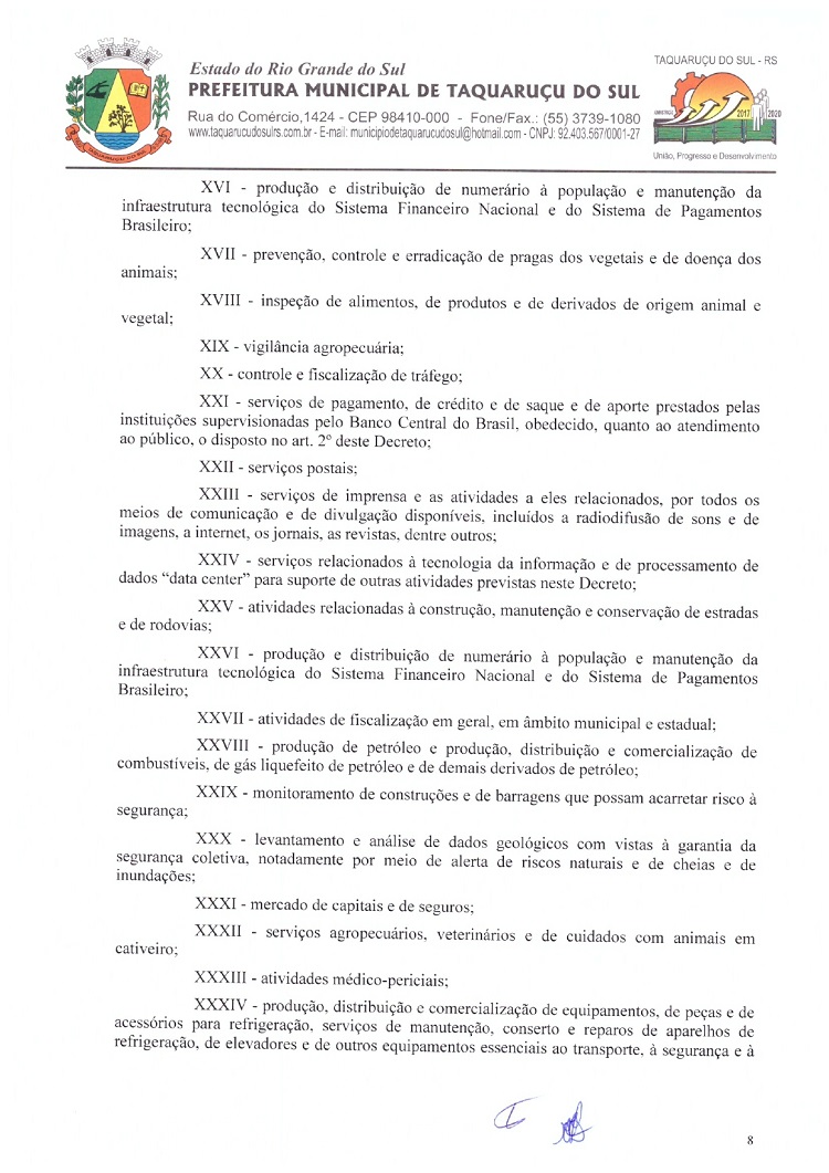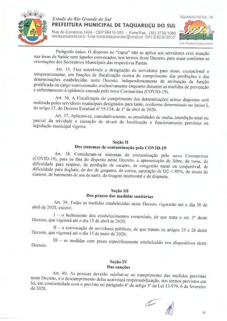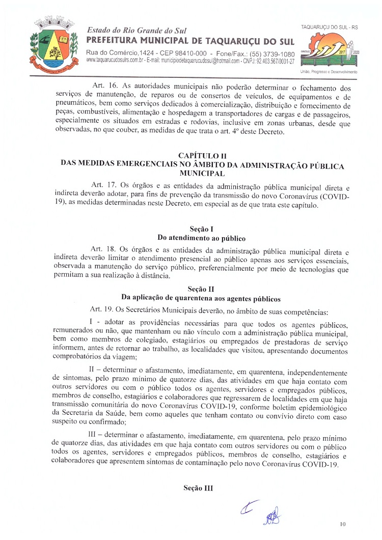 Atendendo as determinações do Governo do Rio Grande do Sul e do Ministério Público de Frederico Westphalen (MP/FW), o prefeito de Taquaruçu do Sul, Valmir Luiz Menegat, assinou na tarde desta sexta-feira, 3, o Decreto Municipal Nº 22, que reitera o estado de calamidade em todo o seu território para prevenir o avanço do Coronavírus (Covid-19). A partir desta data, fica determinado que apenas supermercados, farmácias, postos de combustíveis, agropecuárias, restaurantes e lancherias permaneçam abertos. Os estabelecimentos autorizados devem adotar medidas a fim de evitar aglomerações, utilizando o sistema de tele-entrega, além de fixar horários ou setores exclusivos para clientes com idade superior a 60 anos.