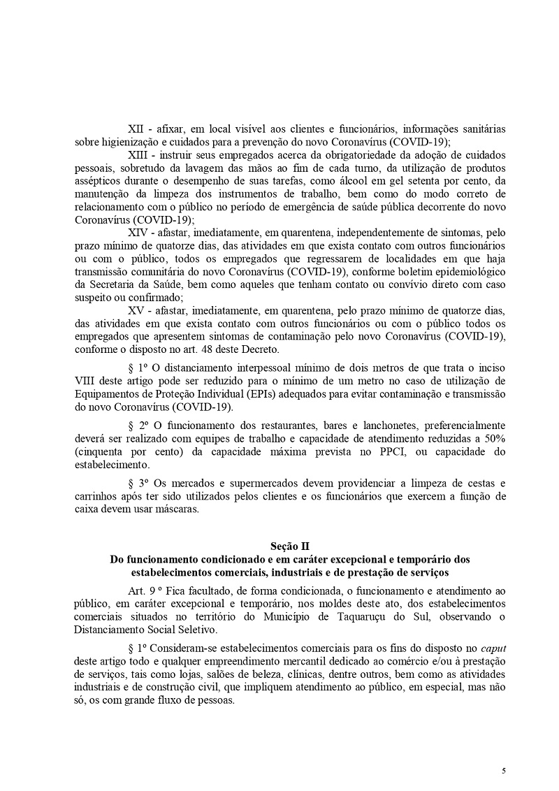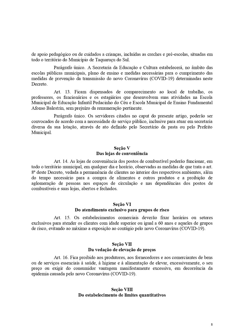 Os funcionários da administração exceto da educação - voltam a trabalhar normalmente no horário de expediente. Já os servidores com mais de 60 anos, gestantes e portadores de doenças crônicas com indicação médica oficial, estão dispensados, desde que, respeitem as normas de isolamento domiciliar. Mais informações podem ser obtidas através do telefone 3739-1079 ou no site da prefeitura www.taquarucudosul.com.br.