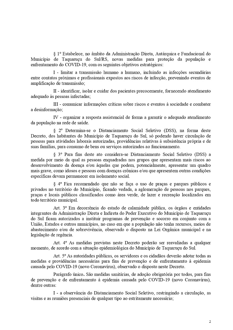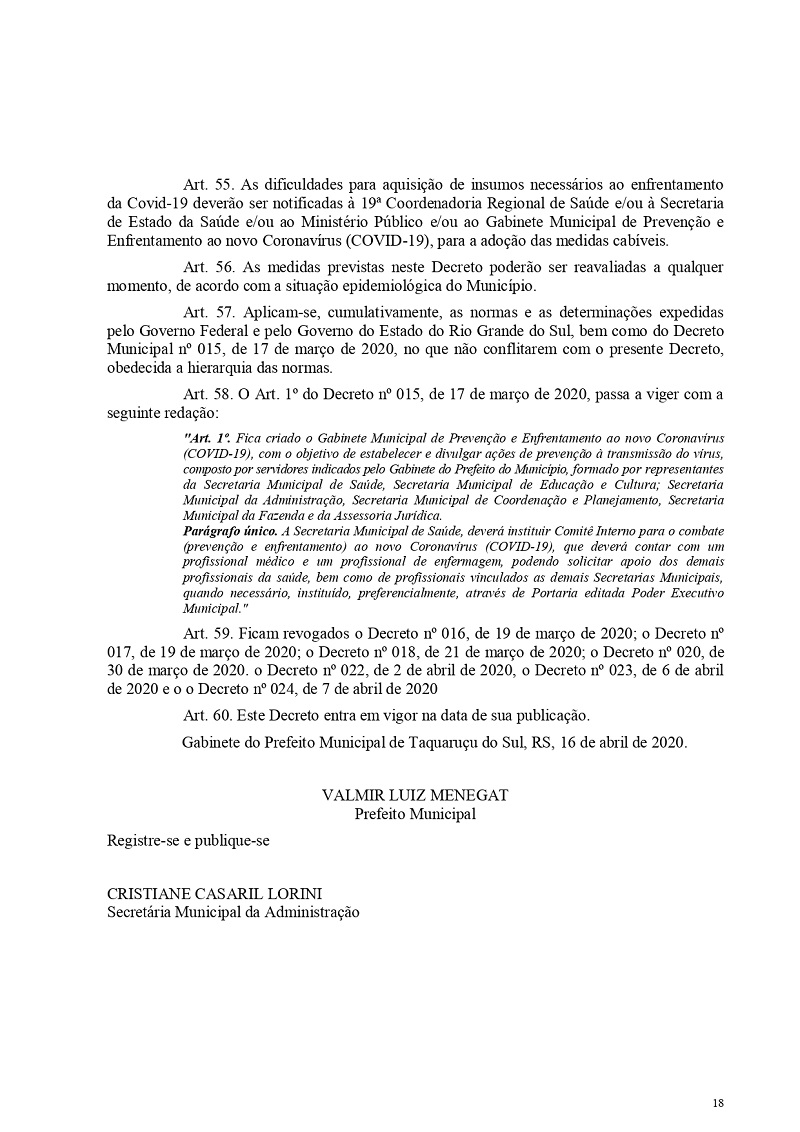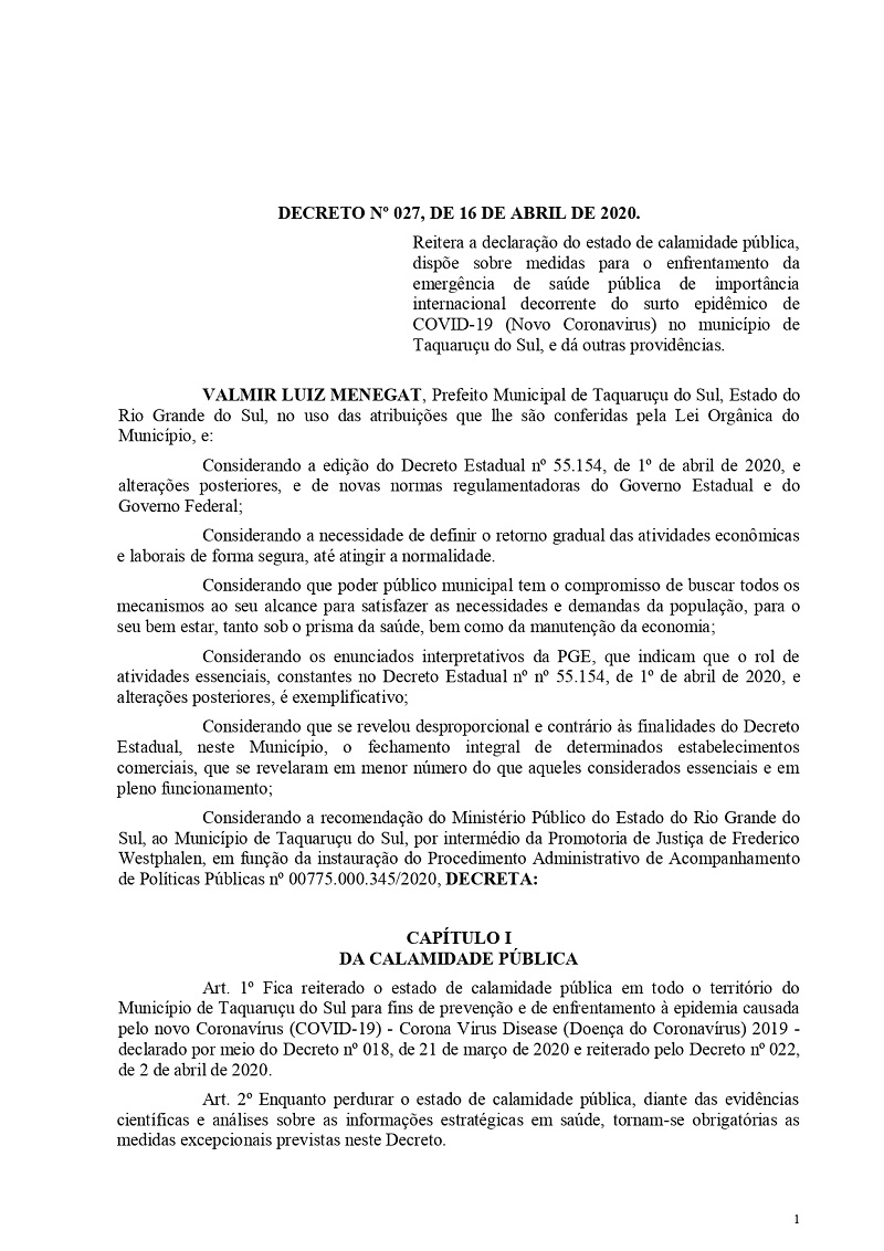 O prefeito de Taquaruçu do Sul, Valmir Luiz Menegat, assinou na tarde desta sexta-feira, 17, o Decreto Municipal de nº27 de 16 de abril de 2020, que autoriza a reabertura do comércio em todo seu território. A decisão foi tomada, após o Governo do Rio Grande do Sul deixar a cargo das administrações municipais a abertura dos estabelecimentos que não estão em áreas de risco caso região metropolitana de Porto Alegre do Coronavírus (Covid-19).