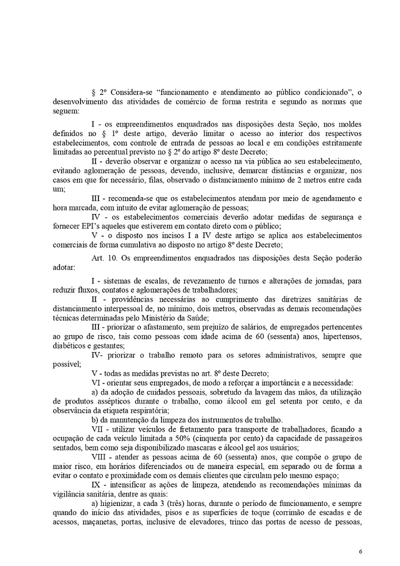 Apesar desta flexibilização, os comerciantes devem continuar seguindo às recomendações das autoridades da saúde, como os cuidados básicos de higienização. Os funcionamentos dos mesmos devem ser realizados com equipes de trabalho e capacidade reduzidas em 50% da capacidade máxima - prevista no PPCI -, evitando assim, as filas e aglomerações. Ficam vedados quaisquer eventos que aglomerem público - como práticas esportivas ou festas nas comunidades. Cultos religiosos estão permitidos, mas não podem ultrapassar o limite de 30 pessoas.