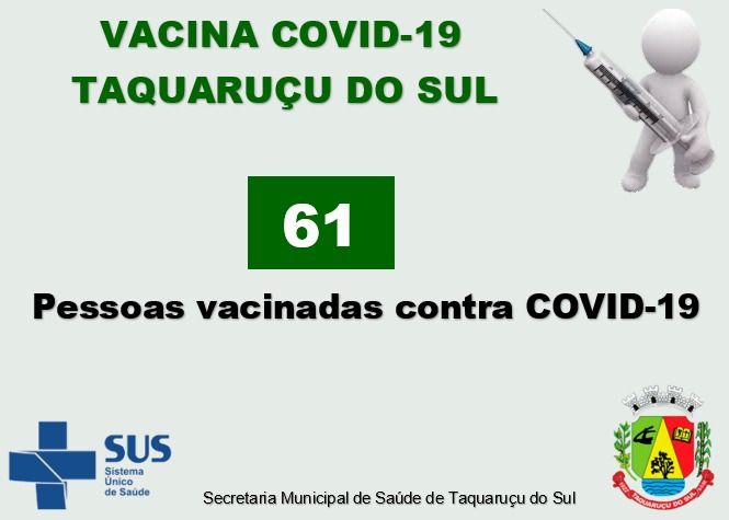 A Secretaria Municipal de Saúde recebeu até o momento 03 LOTES DE DOSES da vacina da Covid-19, e, já foram aplicadas em 61 profissionais de saúde. As primeiras doses chegaram no dia 19/01/2021, para os profissionais da linha de frente ao combate da epidemia. Posteriormente ao recebimento das outras doses foram vacinados profissionais de saúde da rede pública e privada.A ordem, os critérios de escolha, e a prioridade da vacinação contra a COVID-19 na unidade básica de saúde segue rigorosamente de acordo com o Plano Nacional de Operacionalização da Vacinação contra a COVID-19, e também as orientações repassadas pela Coordenadoria de Saúde do Estado.