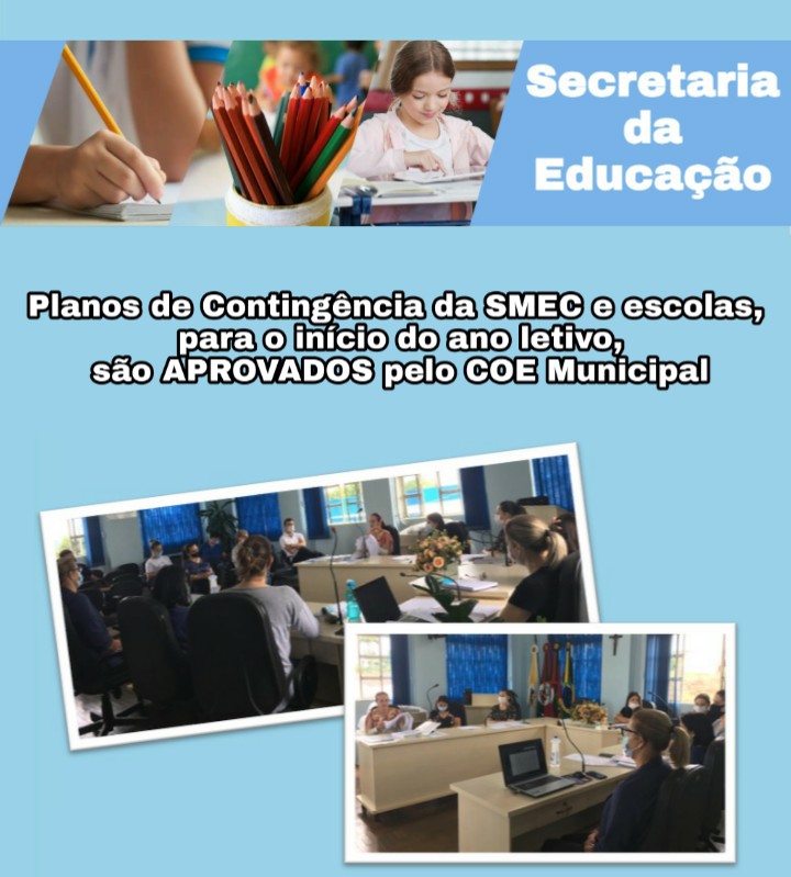 Na semana que passou os membros do COE-Municipal, do COE- E Local, os agentes de Fiscalização do Covid-19, a equipe da SMEC, o assessor jurídico, a psicóloga escolar, se reuniram com o objetivo de debater e aprovar os Planos de Contingência para Prevenção, Monitoramento e Controle da Epidemia do Novo Coronavírus, da Secretaria Municipal de Educação e Cultura e das Escolas Municipais Afonso Balestrin e Pedacinho do Céu.Na oportunidade, também, foram apresentados os Planos de Contingência para o retorno da Escolinha de Futebol e das Oficinas de dança do professor Danilo André Gregory.