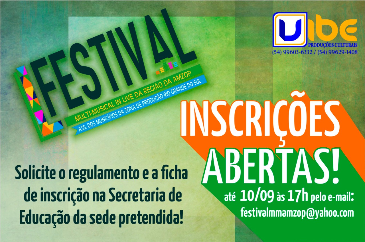 Obs: A idade mínima e máxima levada em consideração na categoria infanto/juvenil, será referente ao dia do festival e não ao dia de realização da inscrição. A categoria amador e profissional será de idade livre, havendo restrição de idade apenas para a categoria infanto/juvenil.